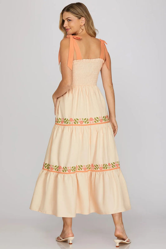 Peach Blossom Embroidered Midi Dress