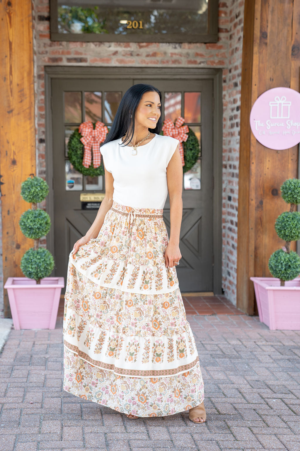Feminine, flowy, and full of charm — the Fields of Grace Maxi Skirt is made for effortless styling. This tiered skirt features a soft floral print in earthy tones, complete with a drawstring waist for the perfect fit. The lightweight fabric moves beautifully, making it ideal for both casual days and dressed-up evenings. Pair it with a simple tee and sneakers for a relaxed look, or style with a blouse and boots for a romantic, boho-inspired outfit.