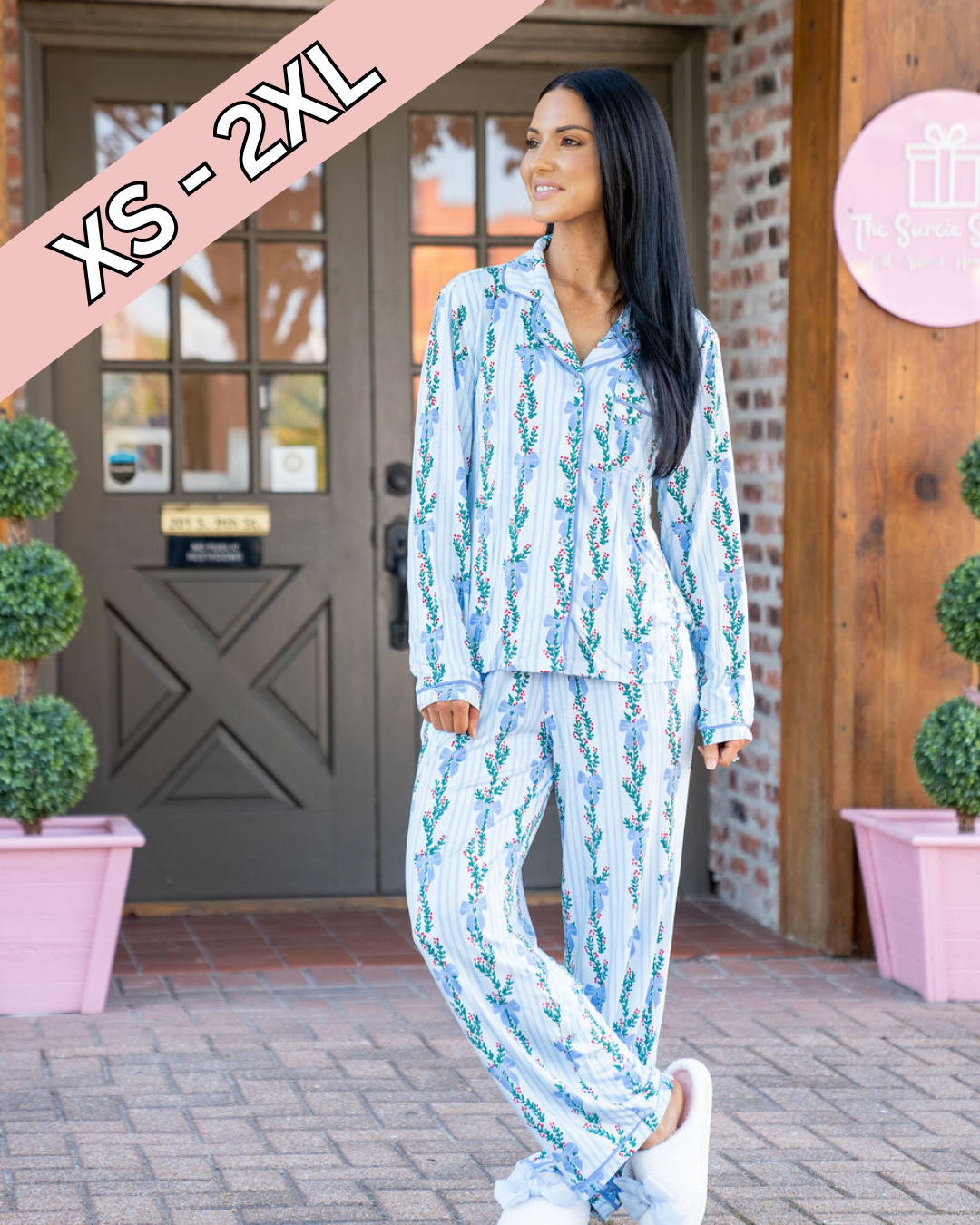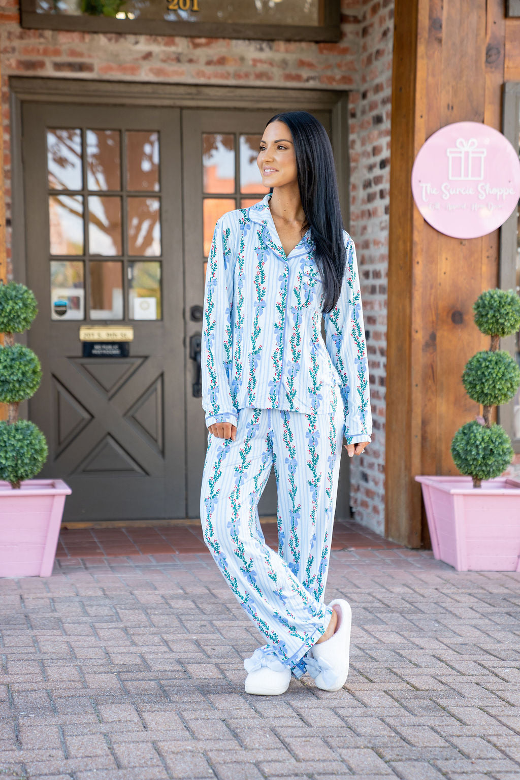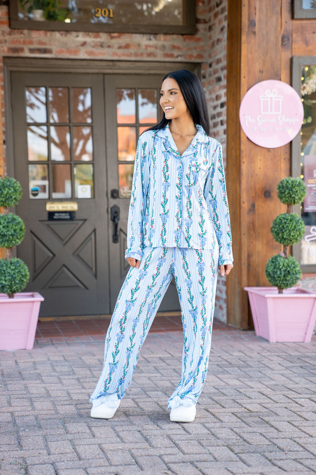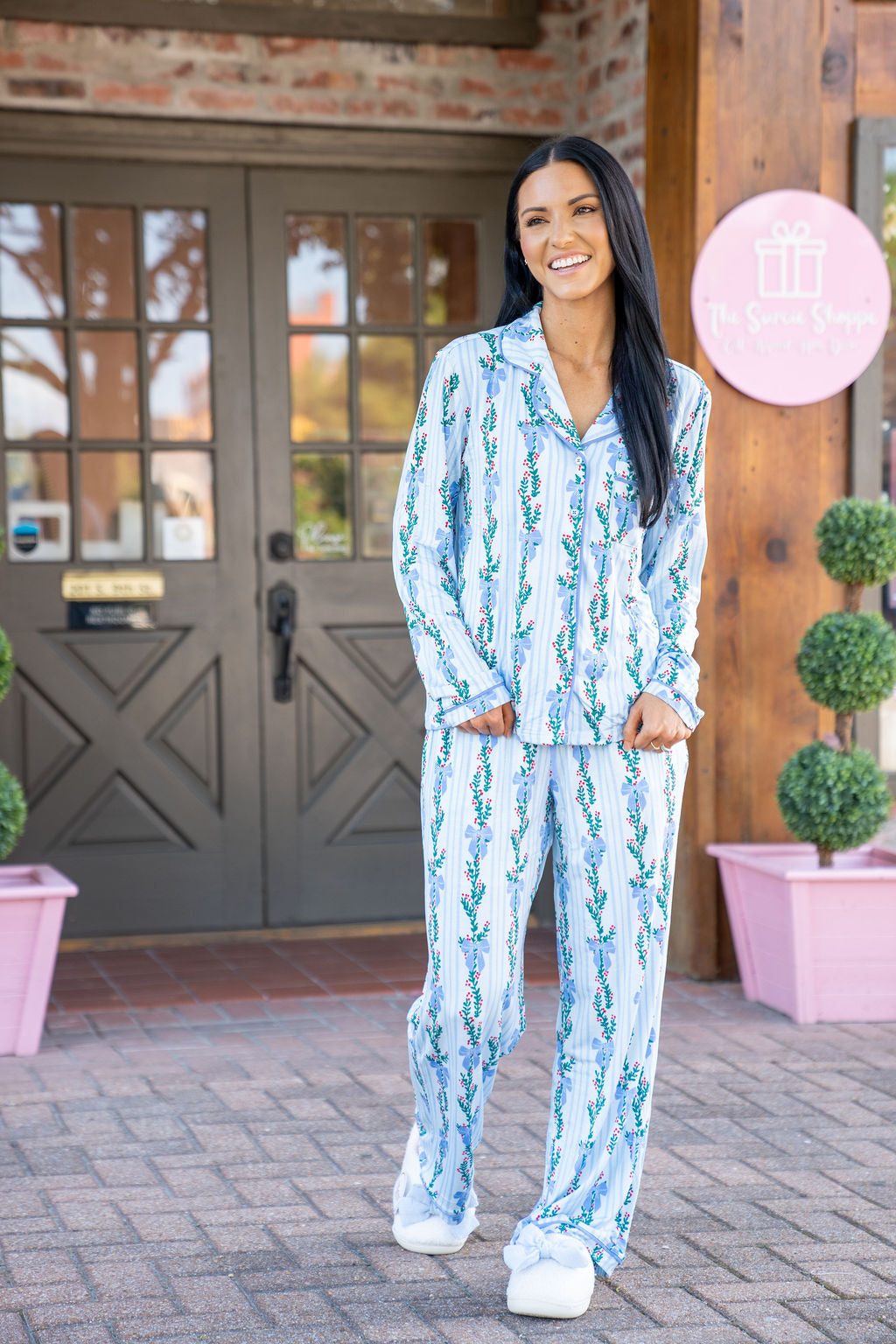 Introducing our Holiday Charlotte Pajama Set, where comfort meets festive charm. Perfect for sipping cocoa by the tree or enjoying Christmas morning in cozy style, this pajama set brings holiday cheer to every moment. Featuring a long-sleeve button-front top with a classic collar and straight-leg pants with an adjustable drawstring, our Charlotte Pajama Set combines classic holiday style with all-day comfort.
