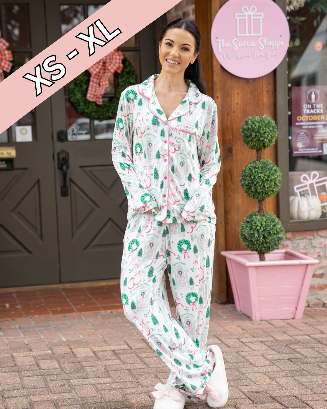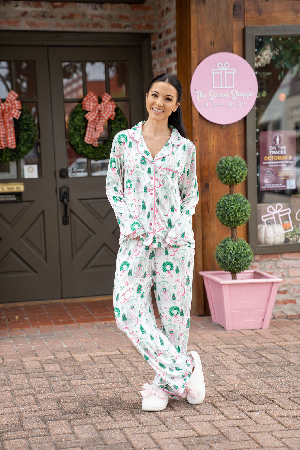 Introducing our Holiday Charlotte Pajama Set, where comfort meets festive charm. Perfect for sipping cocoa by the tree or enjoying Christmas morning in cozy style, this pajama set brings holiday cheer to every moment. Featuring a long-sleeve button-front top with a classic collar and straight-leg pants with an adjustable drawstring, our Charlotte Pajama Set combines classic holiday style with all-day comfort.